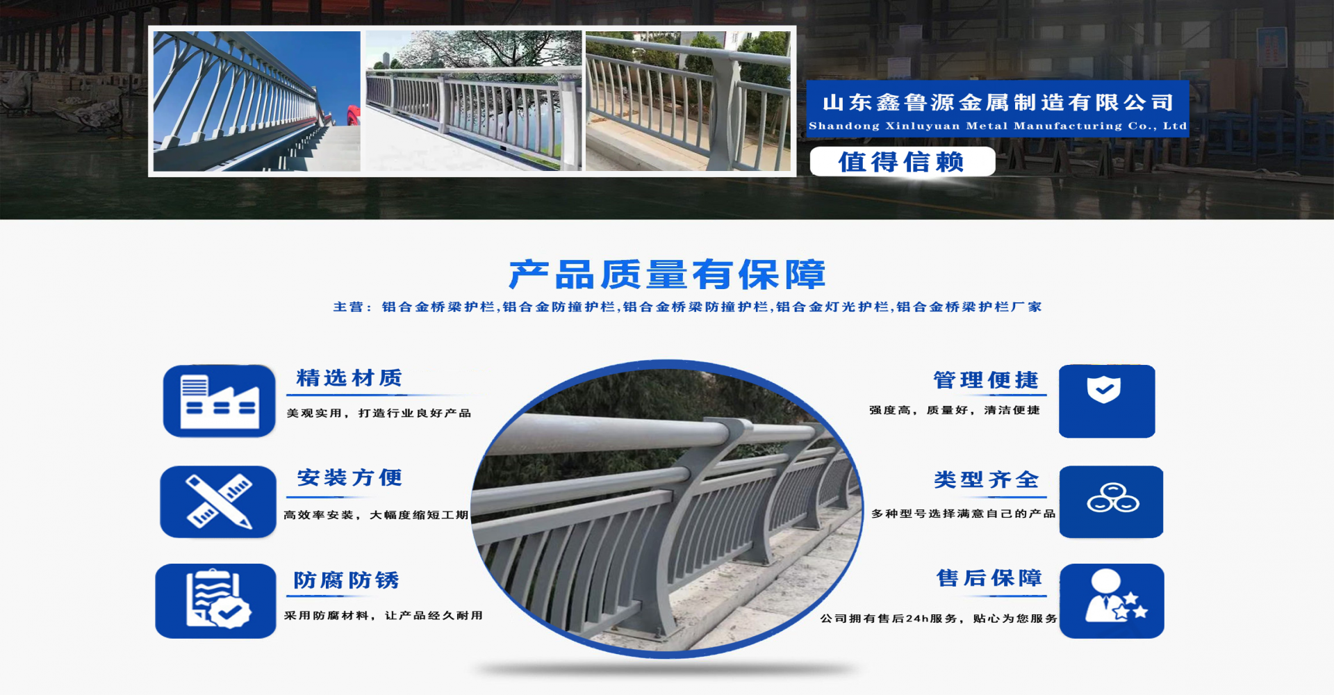 山東鑫魯源金屬制造有限公司主要經營:鋁合金橋梁護欄,鋁合金防撞護欄,鋁合金橋梁防撞護欄,鋁合金燈光護欄,不鋁合金橋梁護欄廠家,環波梁橋梁護欄,環波梁防撞護欄。質量可靠、經濟實用的顯著特點。公司為客戶提供可靠售后保障,堅持“以品質立足、服務求發展”,愿與各界朋友精誠合作、攜手發展!  服務優勢:真誠的服務理念、完善的服務體系。公司專業力量充足;工程案例眾多、從業經驗豐富;公司以可靠質量的產品,合理的價格,完善的售后服務,能夠滿足市場各個企業的需求。  企業精神:執著追求 持續創新執著追求,就是堅持不懈、堅定從容,專注于自己的事業,把能做的事情做好,不斷克服困難、把握機遇,贏得未來。  持續創新,就是生命不息、創新不止,通過持續實施技術創新、管理創新、市場創新,獲取持續的競爭優勢。...